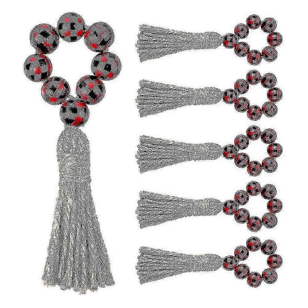 6 Pcs Red And Black Buffalo Plaid Wood Bead Napkin Rings With Tassels PXCL