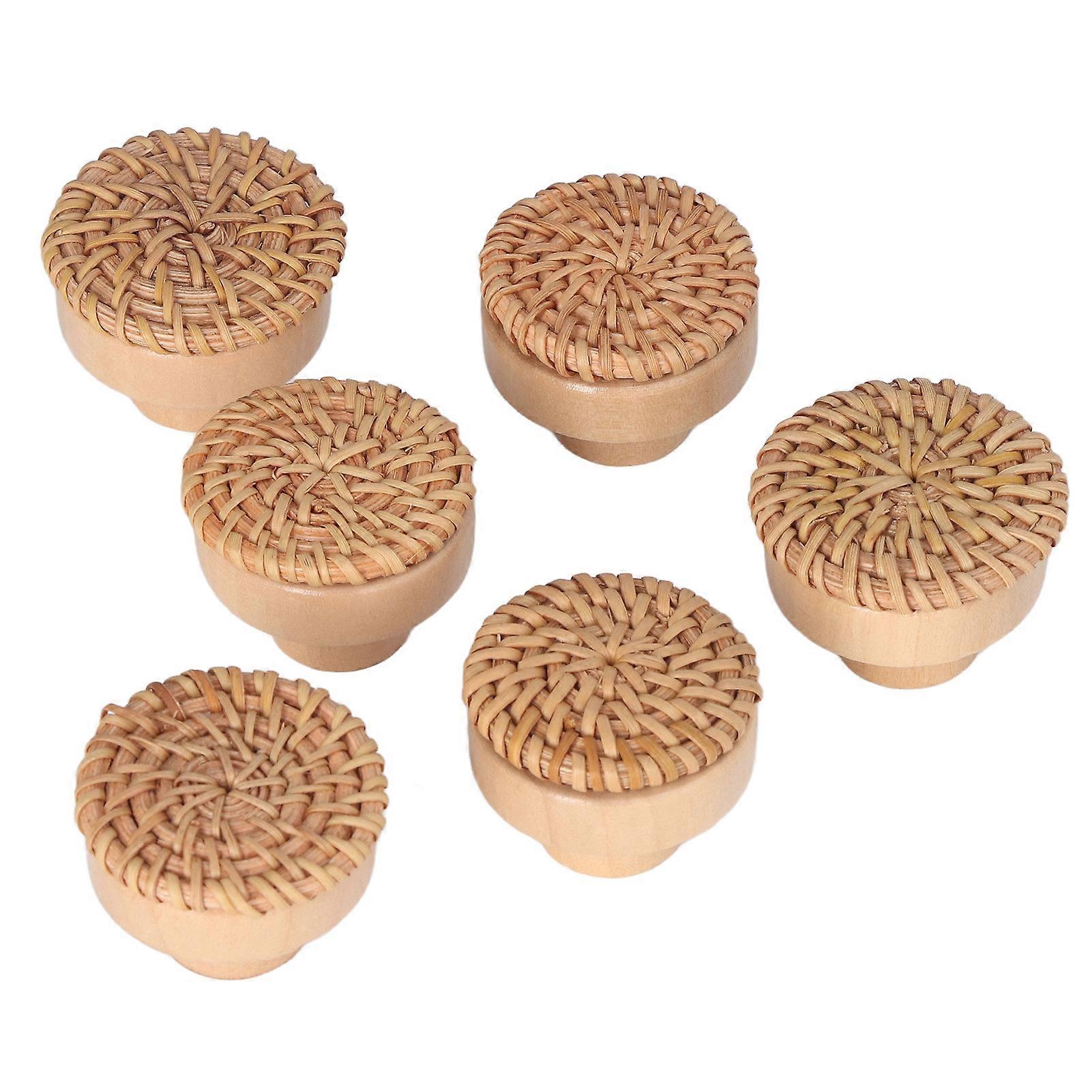 6pcs Round Drawer Knobs Wood Rattan Woven Handmade Drawer Pulls Door Knobs for Kitchen Bedroom Furniture