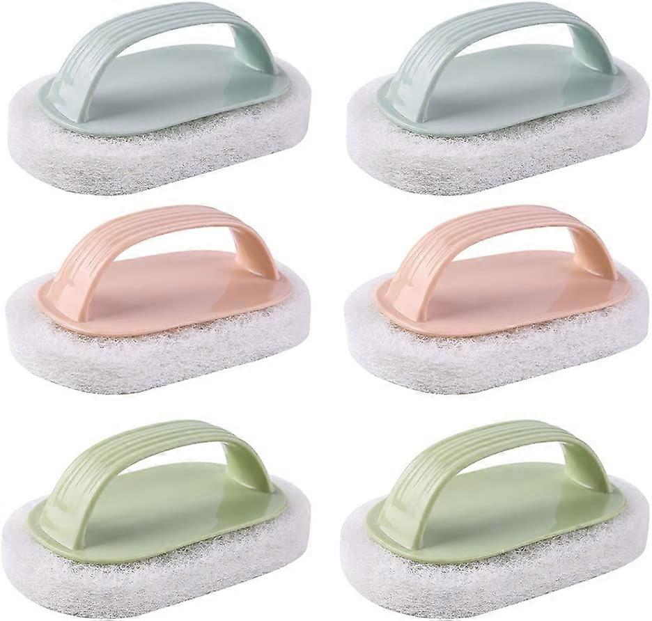 Package 6 Pcs cleaning scrubbers with handle,3colors, each color has 2 pieces,8cm*12cm/3.14in*4.72in,large quantities can meet your family's needs. High qualityThe cleaning brush is made of fiber sponge and plastic,special fibers sponge and does not hurt the item's surface. The sponge brushes can produces rich foam when use dish washing liquid so to easily removes grease and stains,easy to clean and polish. Protect your handsThe sponge brush hold comfortably in palm,reduced hand strain,The handle design reduces the contact between your hands and stains,in the cleaning process,reduce the prolonged immersion of hands in water. Environmental protectionReusable sponge scourers brush,the tub and tile cleaning brush is easy to clean itself with water or detergent and does not produce odor and stains, useful tools that save water and your time, It is both wet and dry, and it becomes soft when exposed to water. Wide applicationCleaning brush works great on cleaning countertop, cutting board, range hood, bathtub,tiles,dishes,glass,floor, etc.removes dirt and non scratches.