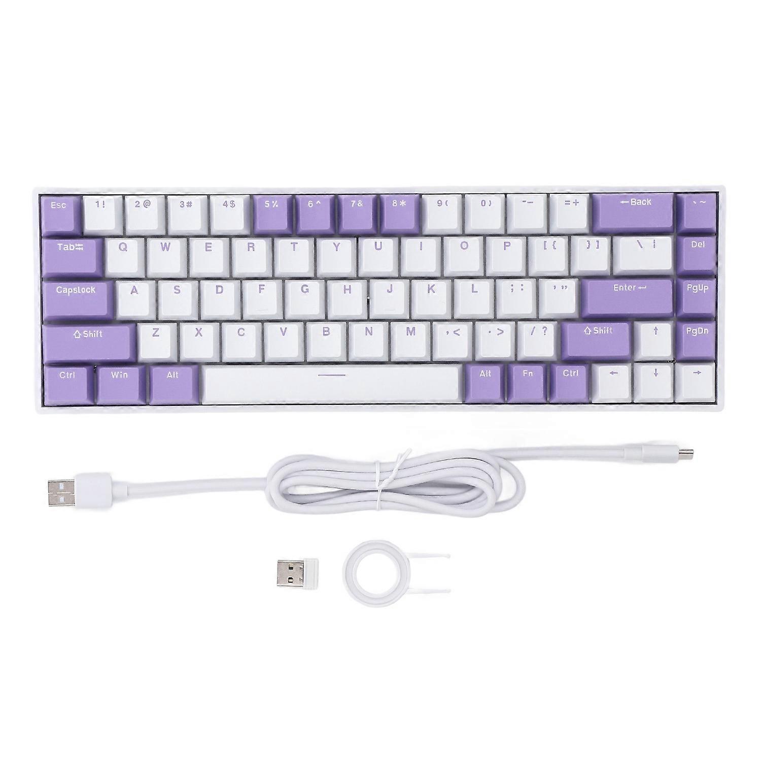 Feature: 1. COMPATIBLE SYSTEMS: This mechanical keyboard is compatible with for Win2000 ME XP, for Win 7, for HarmonyOS, for Win 8, for Win 10, for Android, for IOS and other systems. 2. 68 KEYS 3 MODE KEYBOARD: Supports three modes of connection, wireless or wired. Support wireless 2.4G, BT 3.0, 5.0, Type C wired three modes, so the keys and wires are separated more convenient. 3. 68 KEYS LAYOUT: The optimized 68 key layout still retains the functionality of a full keyboard, and is small and reasonable, making it simple and easy to carry. 4. RGB DYNAMIC BACKLIGHT: Switch between various light effects and adjust the speed and brightness of the light as you wish. The keycaps are translucent, creating a different cool and colorful ambiance. 5. ENERGY EFFICIENT: Built in 3000mAh high capacity rechargeable lithium battery with long lasting battery life, it can be charged at the same time when wired connection is available. Simultaneously pressing all the buttons does not conflict with each other. Specification: Item Type: Keyboard Material: ABS Color: White Bottom Case Keycap: Blueberry Theme Keyboard Switch: Red Switch Connection: Support Wireless 2.4G, BT 3.0, 5.0, Type C Wired Lighting: RGB Multiple Light Modes Key Conflict: All Keys No Conflict Battery Capacity: Built In 3000mAh Lithium Ion Battery (Built In) Ergonomics: Support Hot Swap: Full Key Hot Swap Padding: Dual Layer Padding (Sandwich Cotton, Bottom Cotton) Compatible Systems: For Win2000, ME, XP, For Win 7, For HarmonyOS, For Win 8, For Win 10, For Android, For IOS And Other Systems. Package List: 1 x Keyboard1 x USB Adapter1 x Data Cable1 x Key Puller1 x Instruction Manual