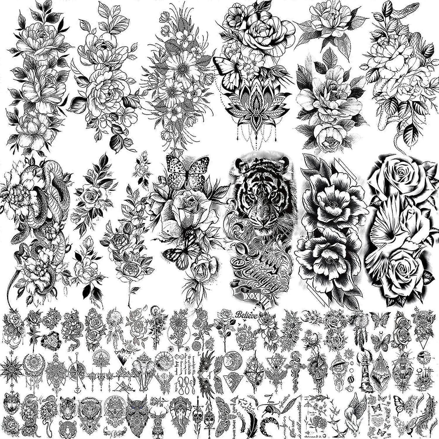 72 SHEETS & LARGE QUANTITY - 72 sheets temporary tattoos stickers for women and girls, including 12 sheets large sexy flowers fake tattoos that look leal and last long, size is 7.5X3.8 inch 12 sheets , and 2.4X4.1 inch 60 sheets. You can share it with your family and friends MIX STYLE - Big rose peony flower tattoo stickers and fake tattoos for women, vintage 3D black flower rose sexy adults temporary tattoos for women and girls LONG LASTING TATTOOS - Tattoo temporary women Lasts for 2 to 5 days. Waterproof, removable, quick and easy to apply. Guaranteed to dazzle, our stickers are perfect for women and girls to get noticed EASY TO USE- Put the temporary flower tattoos and wet it, in less than 30 seconds with long lasting tattoos. These stylish tattoos are easily removable by rubbing baby oil HEALTHY AND SAFE- Semi permanent temporary custom tattoos paper with FDA certification. These rose tattoo temporary are non-toxic and easy to remove, fun for all ages, including kids and adults