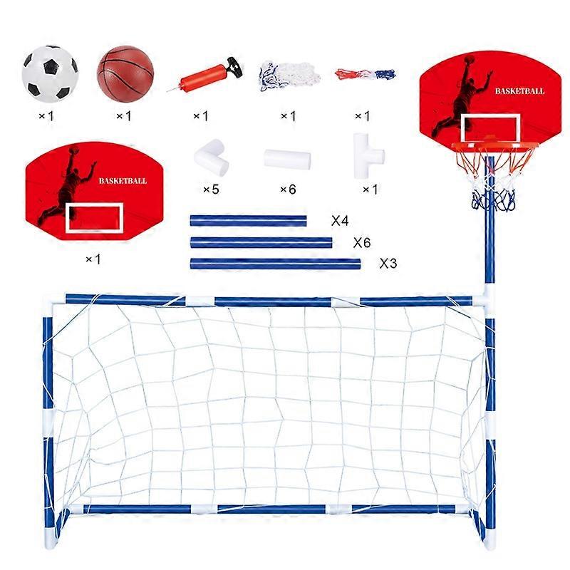 •This 2-in-1 football & basketball toy set is made of high-quality material,which is non-toxic and durable to use •Come with an inflator and 2 different goal nets,let children play football or basketball indoor or outdoor at will •It's perfect for family parties and friend get-togethers,improving coordination between their vision and hand movements •The design of the sports toy is assembly,and easy to assemble,which is loved by either boys or girls. It's a fun and interactive toy that will keep them entertained for hours •Best Birthday gifts for preschool boys and girls. The interesting toy set will bring endless fun and never fail to entertain your kids Package included: •1 x Football •1 x Basketball •1 x Inflator •1 x Football Goal Net •1 x Basketball Goal Net •12 x Adapter •13 x Tubes •Other items not included
