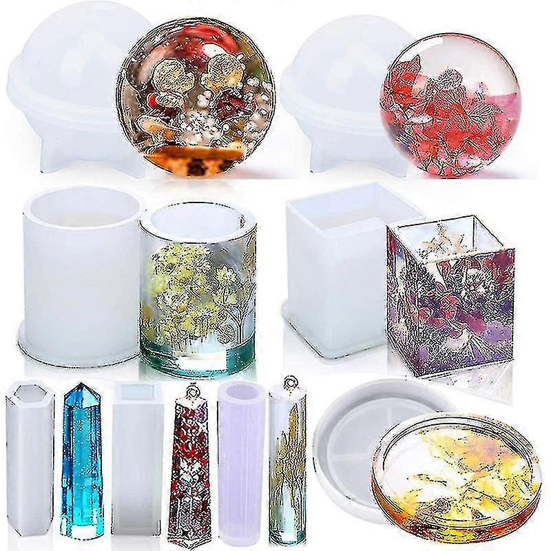 8pcs Silicone Epoxy Resin Casting Art Molds Include Round, Square, Sphere, Pendant, Coaster For Diy