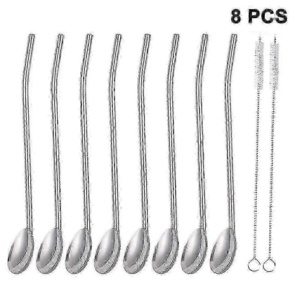 8 Pieces Of Stainless Steel Straw Spoon Oval Coffee Spoon With 2pcs Brush Reusable Fruit Sticks Stirring Spoon Tableware Straw
