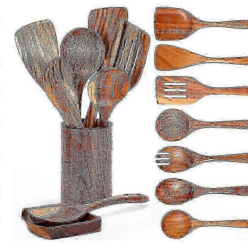 9 PCS Wooden Spoons for Cooking, Wooden Utensils for Cooking with Utensils Holder, Teak Wooden Kitc