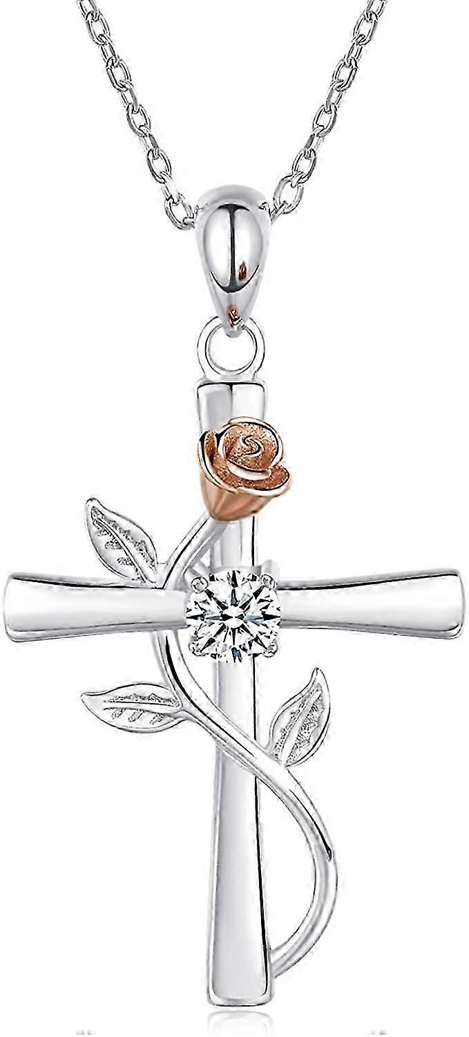 Necklace for Women Cross Rose Pendant 925 Sterling Silver Round Cubic Zirconia Faith Hope Love Rose Flower Necklet Gift for Women