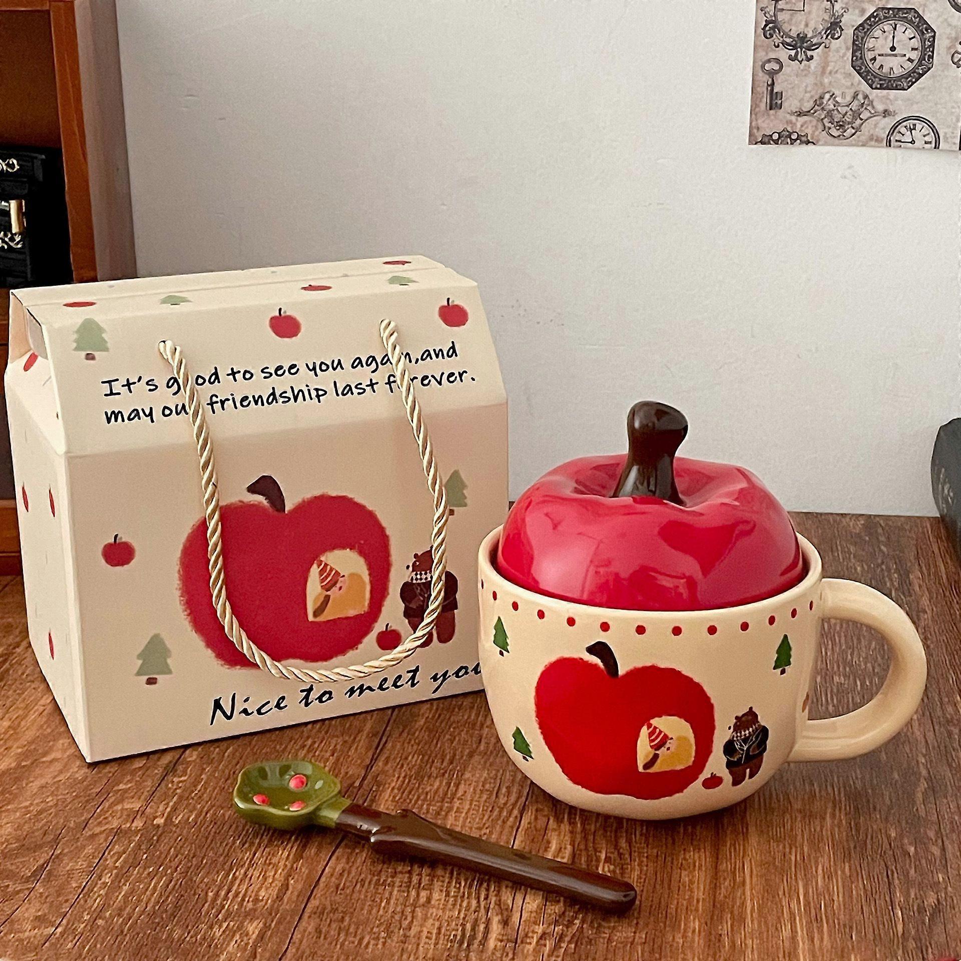 Apple Mug with Lid and Spoon Ceramic Cup 500ml Large Capacity Drinking Cup