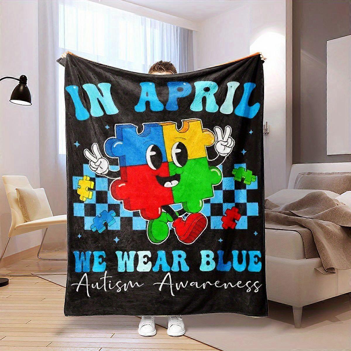 Autism Awareness Polyester Print Blanket - Colorful Puzzle Design with "IN APRIL WE WEAR BLUE" Text, Soft & Comfortable -poiuy393