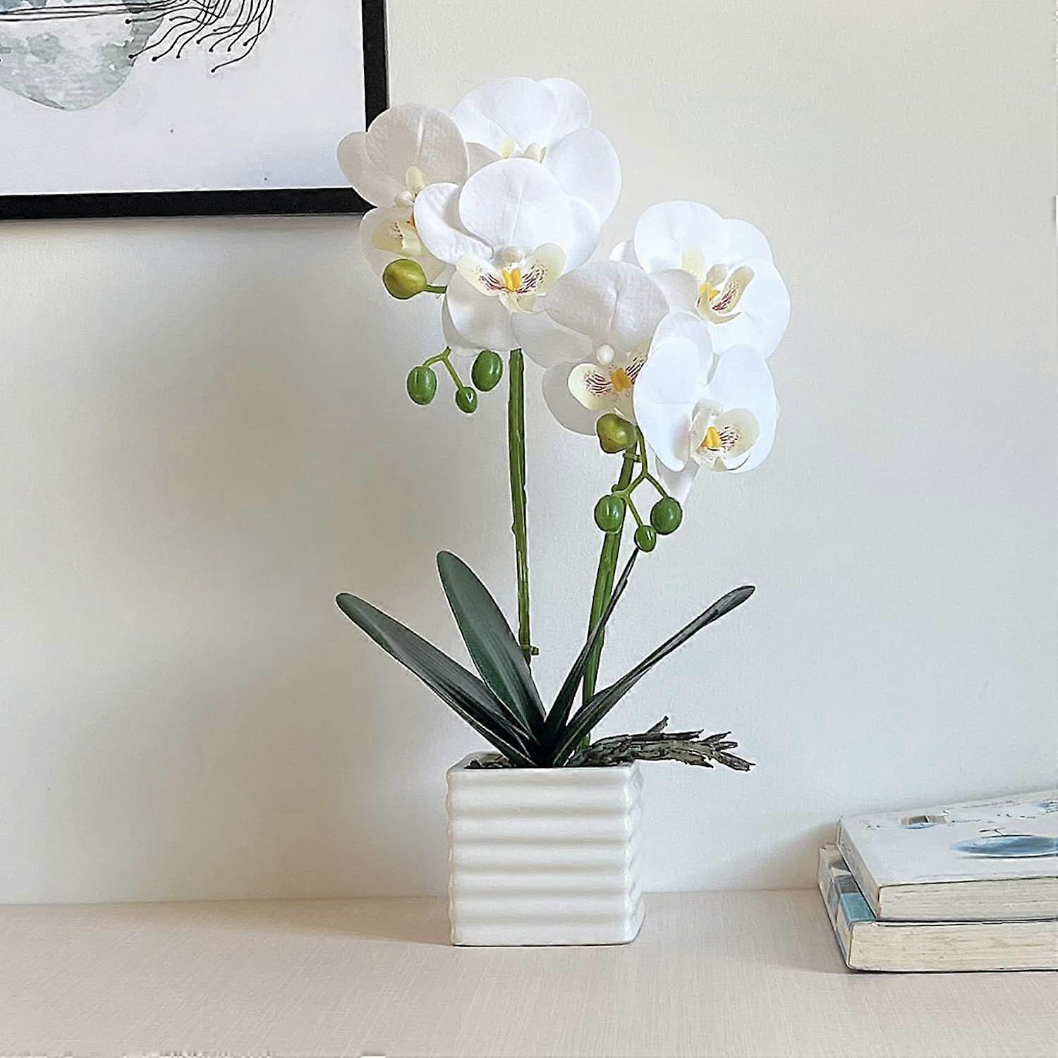 SIZE: 14inch tall orchid arrangement provides a statement piece that complements a variety of room sizes. LOW MAINTENANCE: Unlike live plants, artificial orchids require no watering and sunlight, effortlessly complementing your decor. EASY DISPLAY: Mounted on sturdy stems with lush green foliage, these orchids come prearranged in vases for easy display. VERSATILE DISPLAY: Housed in a sleek white vase, it can be displayed on a table, shelf, or windowsill for added elegance. LIFELIKE APPEARANCE: Carefully crafted to replicate the natural beauty of real flowers.