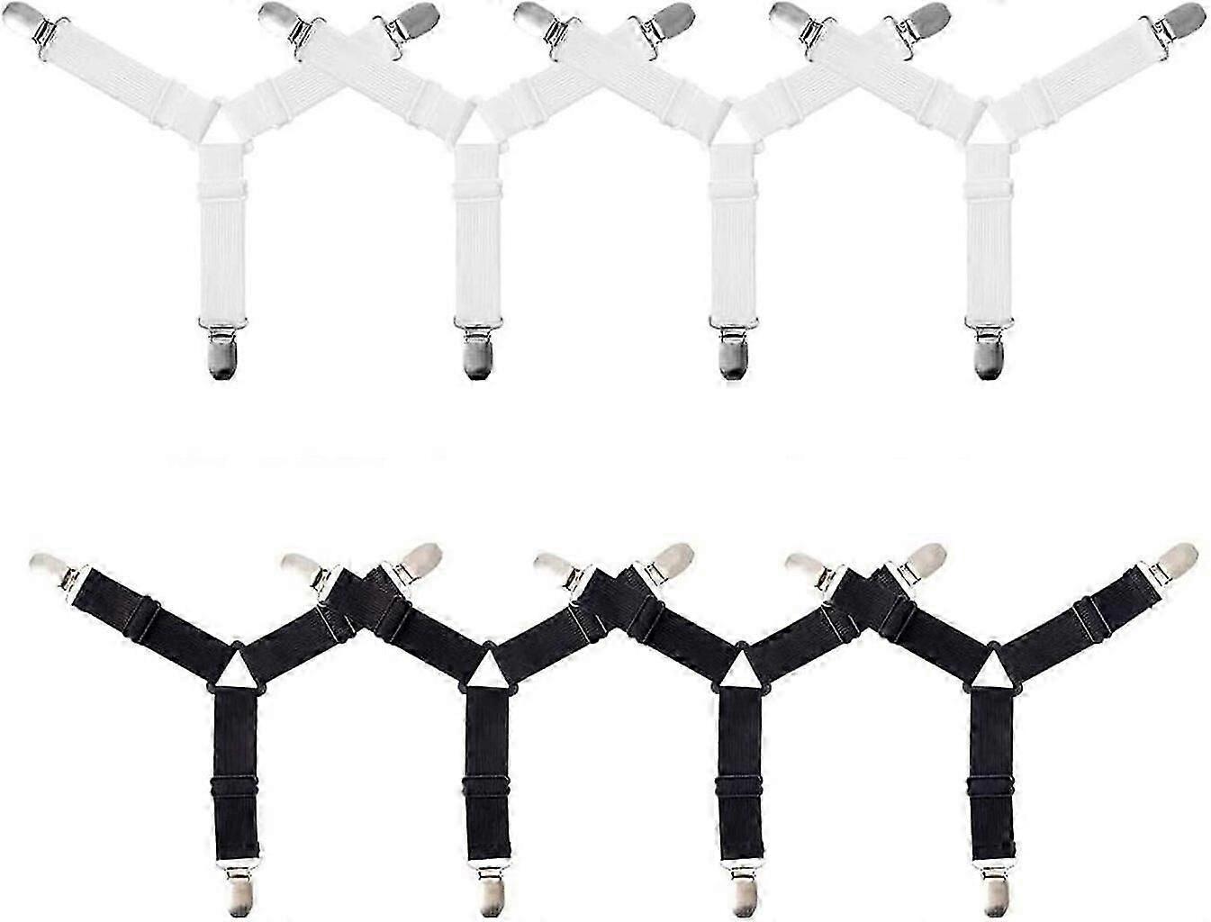 Package includes: 2 sets of sheet fixing straps, 4 pieces. Black 4 pieces. White. No need to worry about dirty or wrinkled sheets. Safe Clips are More Durable: The straps of the sheet fixer are metal, and the teeth of the clips are plastic. It not only helps to fix the sheets securely, but also protects the sheets, so you don't have to worry about the sheets being torn. Adjustable Length: Equipped with elastic bands, which can provide the necessary tension and fit different types of bedding, the sheet tie straps can be adjusted according to your personal needs. Easy to Use: Simply attach the 2 clips at both ends to any corner of the mattress. Slide it under the mattress and then secure the other end of the clip to the sheet. Avoid struggling to lift or turn a heavy mattress. Wide Compatibility: These sheet clamps are compatible with a variety of sheets, and can be used for bed sheets, mattress covers, sofa cushions, cribs, hospital beds, air beds, etc. Specifications: Color: Black/White Material: Elastic sheet straps + Plastic teeth inside metal clips. Package List: 2 Sets of Sheet Straps (4 x Black Sheet Straps, 4 x White Sheet Straps) Features: 1. As we all know, triangle shapes are more stable than other shapes. So our triangle sheet holder can always keep your sheets tight. 2. If you have any questions about the product, please contact us. We will solve the problem for you immediately. Remember, your satisfaction is our top priority.