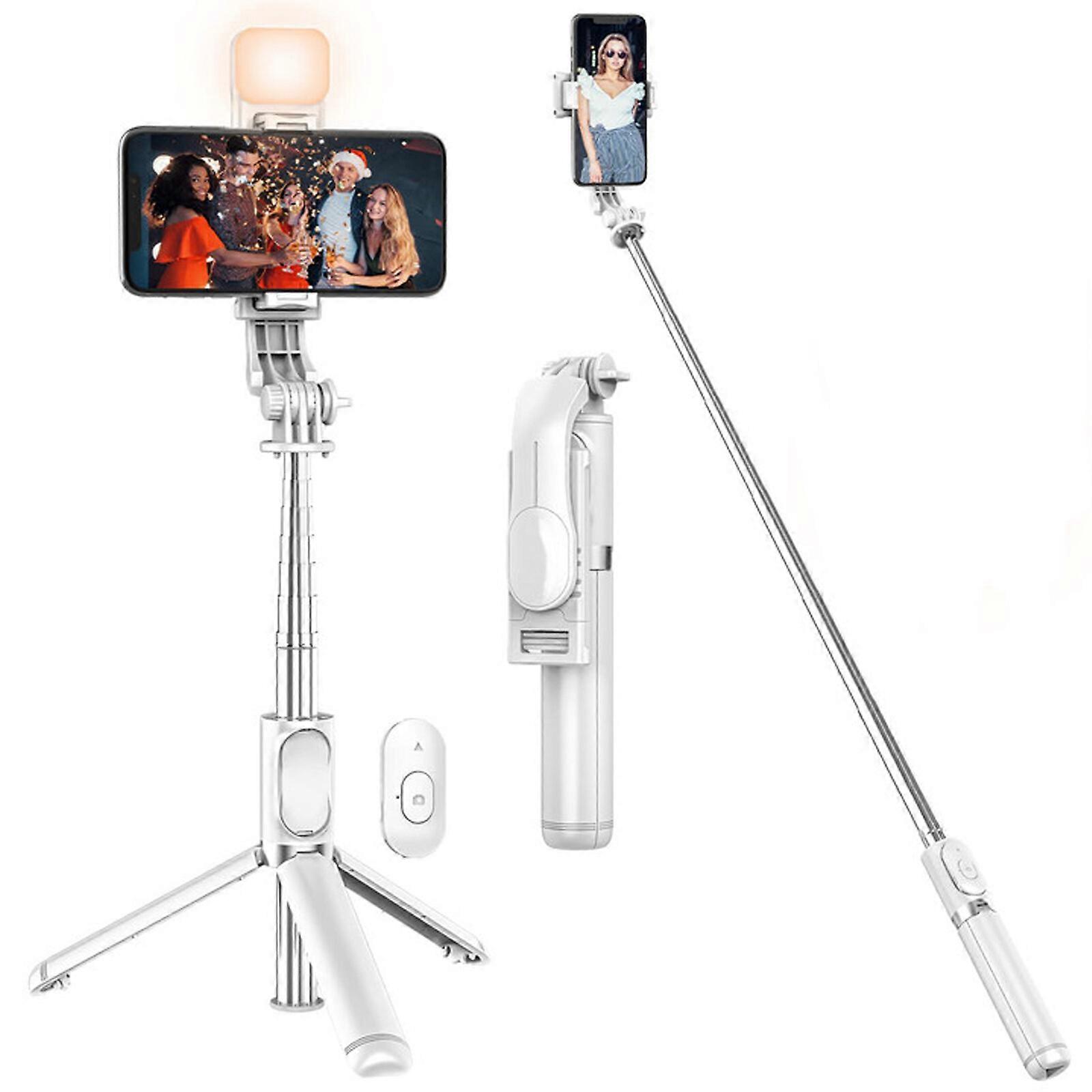 Features 1. Professional Design: The 6-in-1 selfie stick tripod with detachable wireless remote control makes it easier to take a selfie, take group photos or record videos. Telescopic poles are made of durable stainless steel, light weigth and durable. 2. Adjustable Rotatable Phone Holder: Rotate the mobile phone stand by 360, which is easy to use. You can rotate it and choose landscape or portrait camera mode for multi-angle photography, free selfie or group photo. 3. Handheld Selfie Stick Stabilizer: The selfie stick stabilizer can easily shoots balanced videos , and reduce the jitter of friends or family members during shooting. In addition, the self-timer tripod also has a light filling function. 4. Compatible with Stable Bluetooth Connection: Bluetooth camera tripod can be perfectly compatible with most mobile phones on the market. It is equipped with a fast and stable Bluetooth connection with a connection range of up to 33ft. 5. Widely Use: This selfie stick tripod provides you with our multi-functional professional portfolio to do your photography by going up one flight of stairs. Perfect for selfies, group photos, adventure trips, video blogs, podcasts, Facebook live broadcasts, FaceTime, Instagram, live streaming. It can also be used as a mobile phone stand. Specification Material: Stainless steel Size: 19.4 x 4.5 x 3.5 cm Color: Black, White Weight: 164 g Working voltage: 3 V Bluetooth distnace: 10 m Charging current: DC5V/100 mA Package Include: 1x Wireless Bluetooth Selfie Stick