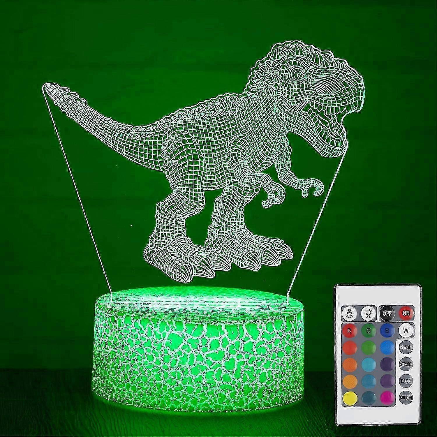Amazing 3D Illusion Effect Dinosaur night light adopts 3D tech to give you stunning 3D visual feast, with a realistic TRex pattern on the acrylic plate. It makes your room unique and fun a perfect ornament for bedroom, living room or dorm. This dinosaur lamp is definitely a great dinosaur gifts Remote Control and Smart Touch The 3D dinosaur night light picks up 7 single colors with a simple touch of button, or use remote control to dim brightness, choose from 16 static colors as well as 4 dynamic modes. In addition, the memory function of dinosaur lamp helps store the last settings, no hassle of adjusting the night lights every time Easy Power Supply Dinosaur T-rex night light for kids has two ways to replenish energy: USB cable or 3 x AA batteries (not included). Thus convenient to decorate anywhere, also your kids can take this cool toy on the trip. LED Dcor Lamp makes it energy-efficient and bright all night Safe and Reliable Premium acrylic panel and ABS base build the 3D toy Dinosaur TRex lamp for kids with high durability and safety. Low working heat, safe for babies to touch. The soft, stable, uniform light with no flicker, protects kids eyes and coaxes them to fall asleep Friendly Customer Service We stand by the quality of our 3D night light lamps which are strictly tested before shipped. If you have any question or our dinosaur night lights do not live up your exception, please feel free to . We will be quick to reply and make it right for you Note: Due to the light and screen setting difference, the item's color may be slightly different from the pictures. Please allow slight dimension difference due to different manual measurement.