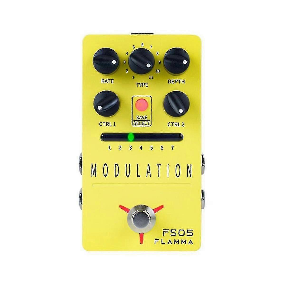 offering 11 different modulation effects that guitarist needs . This bright-yellow pedal is great for a space-conscious pedalboard without sacrificing stereo functionality and tone quality. High-quality stereo modulation effects 11 modulation effects from classic to experimental 7 preset slots for saving your favorite Plug Type:EU Plug,it applies to Indonesia, , , , and so on Color: yellow : aluminum True bypass Support 9V 300mA center negative power supply(the package doesn't included it ). use power supply with 9V and at least 210mA current value for the unit. Incorrect power supply may cause short-circuit and damage. 7 preset slots When any parameter is changed that is different from the saved preset parameters, the LED indicator will blink slowly indicating the change has not yet been saved. Press and hold the SAVE button to save current . The LED will blink swiftly, indicating the preset has been saved successfully.Pressing the SAVE button quickly will change to the effect without saving. Switch presets Press the SAVE/SELECT button to switch between the 7 different modulation effects. LED indicates the currently effect. True bypass Reset To reset the pedal to , first power off the pedal. , press and hold the SAVE button while powering the pedal back on. The 7 LED indicators will begin to blink. Release the SAVE button LED, then wait until the indicators stop blinking to complete the reset. You can cancel the reset by unplugging the power supply releasing the SAVE button. Package Contents: 1 x Guitar Effects Pedal Only the above package content, other products are not included. Note: Light reflection and different displays may cause the color of the item in the a little different from the real thing. The measurement allowed error is +/- 1-3cm.