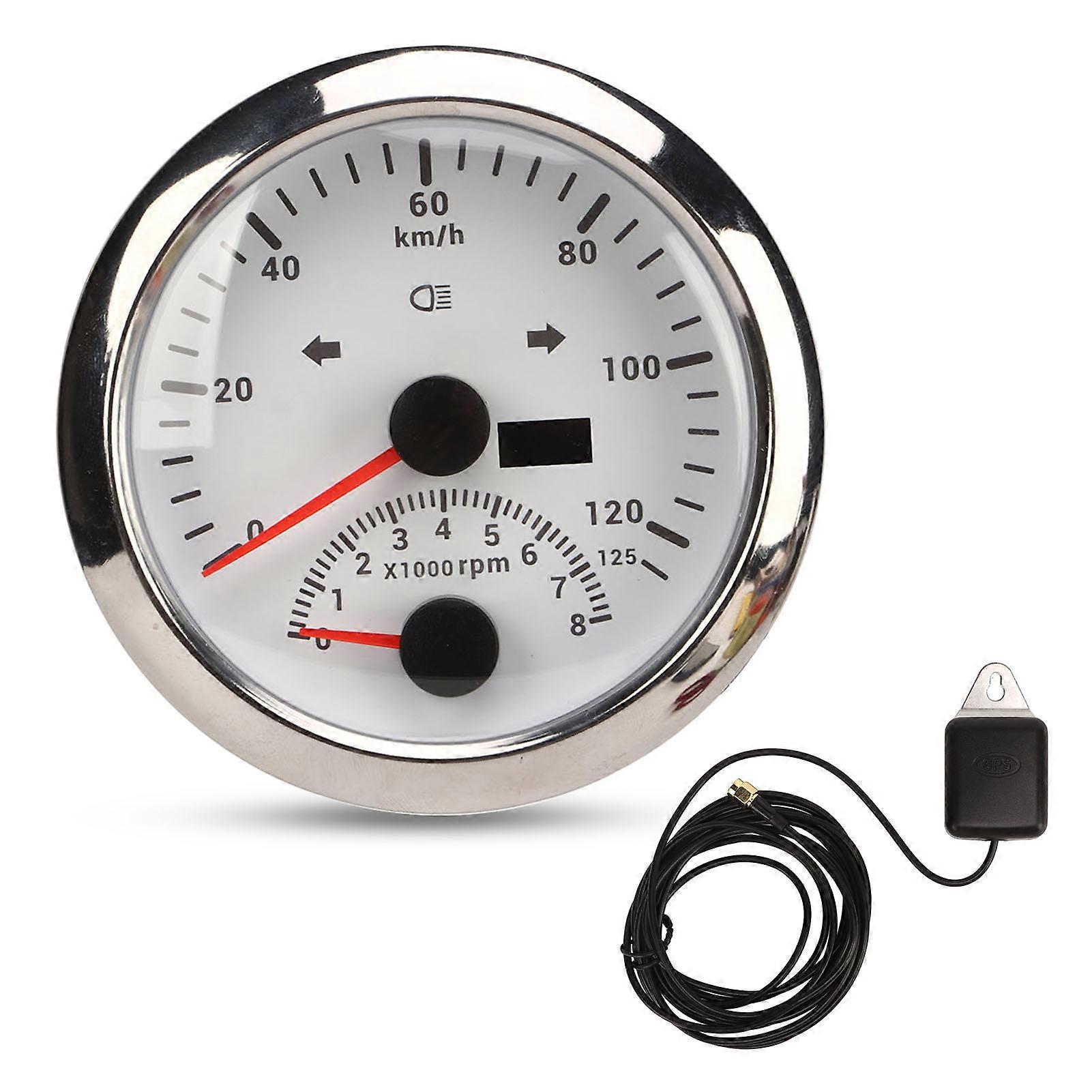 GPS Speedometer with Tachometer 8000 RPM 85mm 3 3/8 in GPS Speedometer with Indiction Light for Marine ATV Vehicle White Dial Silver Bezel