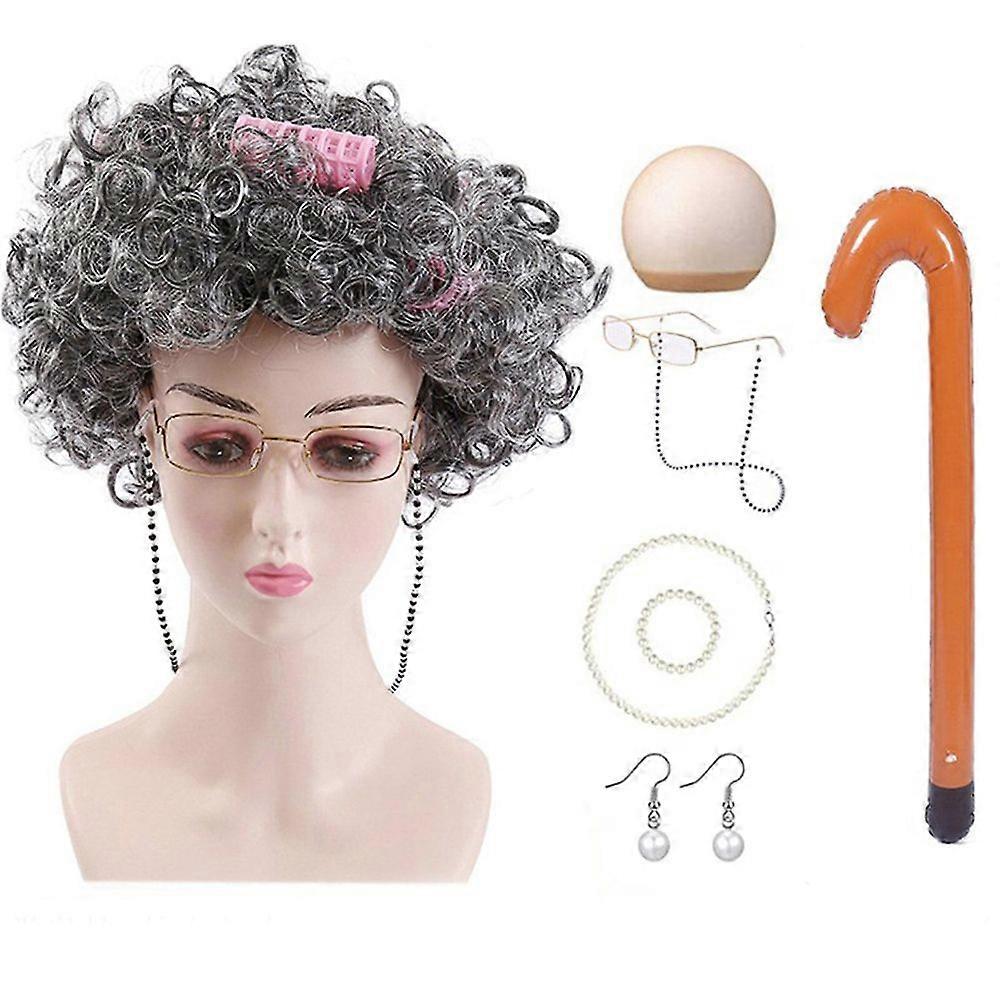 HJyang 8 Pieces Granny Costume Set For Girls, Old Lady Cosplay Accessories With Wig, Glasses, Necklace, And Walking St EMN