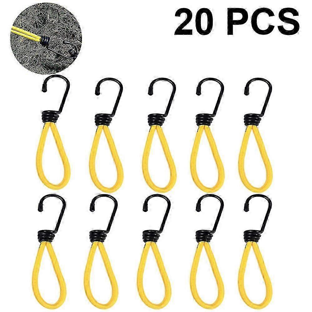 Product descriptionMaterial: latexSize: 15cm elastic pull buckle, diameter 6mmColor: yellowQuantity: 20 piecesPackage content: 12 / 20pcs camping tent elastic cord buckle1. HIGH QUALITY MATERIALS: The expander hooks consist of a mixture of flexible latex (elastic ring) and heavy steel (hook) and are optimized to withstand more pressure. Durable, flexible, good grip, great resistance.2. SIZE: The total length including the hook is 15cm, and the diameter of the elastic rope is 6mm. Thanks to the reliable elastic rope, the tarpaulin and banner have the greatest stability.3. INSTRUCTIONS FOR USE: Feed the loop through the eyelet of the tent, for example, pull the hook through the loop and pull it tight. Can be installed in seconds. The simple adjustment ensures that you are of just the right length and tension.4. EXTREMELY VERSATILE: Lashing ropes with hooks help when setting tarpaulins and attaching fairy lights or other decorations to the fence. Used to fix and tie the tent to make it secure. A good tool for outdoor camping, hiking. Convenient to use.5. REUSABLE: The rubber tensioners can be attached and removed by you in seconds. The plastic and rubber are weatherproof.