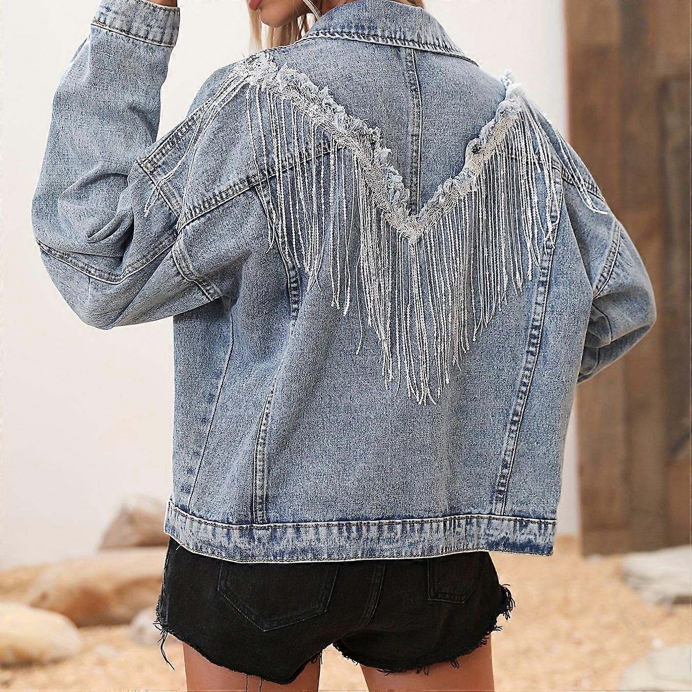 JUNGE Light Blue Tassel Sequins Denim Jackets, Long Sleeve Flap Pockets Single-Breasted Button Loose Fit Denim Coats, Women's Denim Clothing - perfect