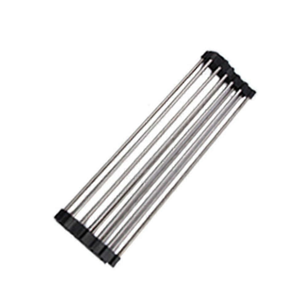 MULTIFUNCTIONAL - The roll up dish drying storage rack holder can be used not only for drying kitchen utensils but also be a colander, a preparation desk put over the sink or a trivet for hot bowls to put on. For water drain and storage purposes.HIGH QUALITY - Made of Stainless steel + TPE which guarantees its long life and makes the rack organizer durable and non-slip.HEAT-RESISTANT - The TPE cover end roller sink mat dish dryer rack is thermal resistant and can be used as a trivet matt on the countertop for hot pots and pans.EASY IN USE - folding, multi purpose, stainless steel drying counter is easily to clean and is rust resistant which let you wash the mat in a dishwasher.Colour: blackMaterial: stainless steel + TPESize: (18 tubes) 47 x 35cmPackage Contents:1 x drain rackOnly the above package content, other products are not included.Note: Light shooting and different displays may cause the color of the item in the picture a little different from the real thing. The measurement allowed error is +/- 1-3cm.