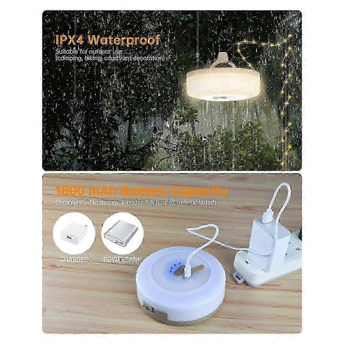 [2-IN-1 Camping Lights] 2024 upgraded camping gear. This camping light can not only be used as camping lighting, emergency lighting, flashlights, distress signal lights, but also as a 32.8FT outdoor string light for home decoration, tent decoration, birthday and holiday decoration, and wedding decoration. [USB Rechargeable] The camping lantern rechargeable has a built-in 1800mAh, which can be fully in 3-4 hours and can last for 3-8 hours. And the power bank connection is convenient, very suitable for outdoor activities. Four power indicator lights display the battery level of the camping light, reminding you to charge in a timely manner. (USB-C cable Included) [5 Lighting Modes] The camping light & lantern has two switches that control the light string and camping lighting. The camping lantern has full light, half light(Cold White Light) and distress signal lights. The LED string lights has 3 lighting modes (constant on, flashing, breathing modes). They can be used as small pendant lights that can be hung over the top of the tent. [ & Waterproof] The LED string lights is made of copper wire and Upgraded transparent PVC material, which has high flexibility and is not easy to , providing clear 360 degree lighting. The camping light string has an IPX4 waterproof rating, making it an Perfect choice for both indoor and outdoor activities. [Portable & Easy to Use] The The camping light & lantern with only 0.5 pounds and has a compact design (that can be carried in a backpack or handbag, making it very convenient and space saving. Simply turn the storage handle and you can effortlessly roll up the light strip in 25 seconds. It is a great choice for camping, fishing, outdoor activities, hiking, car maintenance, emergency lighting, and more. Colour:Desert Yellow Material:Plastic Package Contents: 1 * Outdoor Camping String Light 1 * USB Cable Only the above package content, other products are not included. Note: Light reflection and different displays may cause the color of the item in the picture a little different from the real thing. The measurement allowed error is +/- 1-3cm.