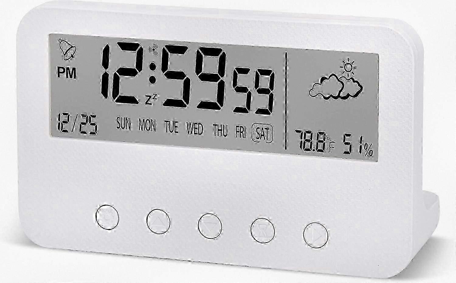 Modern Digital Alarm Clock for Bedrooms, Battery-Powered Desk Clock with Countdown, Weather Display, Night Light, and Date