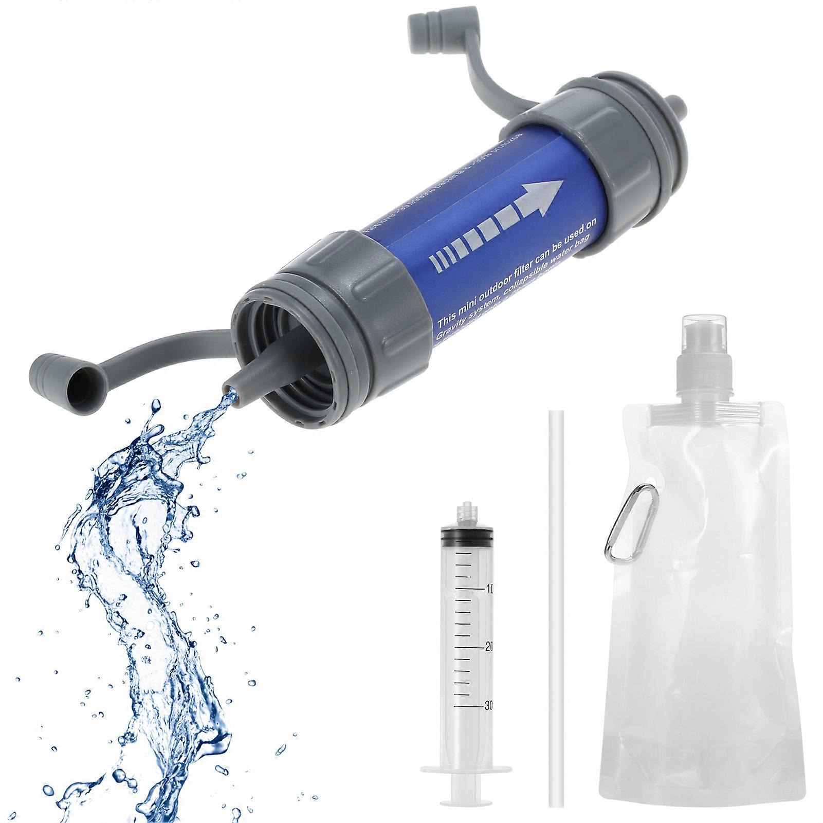 Outdoor Water Filtration System Water Filter Straw Purifier with Drinking Pouch for Emergency Preparedness Camping Traveling Backpacking This water filter straw can effectively remove the particles in the water to provide clean, safe water. It is perfect for outdoor emergency, camping, hiking, backpacking, etc. Features: 0.01 micron hollow-fiber UF membrane removes 99.9999% of waterborne particles and impurities, providing safe clear drinking water. Attaches to the included drinking pouch, or use the straw to drink directly from water source, also fits water bottle with 28mm threads. Mini size fits in the palm and weighs just 1.7 ounces, made from ABS material to ensure long service life. Filter rated up to 5000L. Full package includes a mini filter straw, drinking pouch, extension tube, and cleaning syringe. Perfect for outdoor adventure, emergency preparedness, camping, hiking, backpacking, traveling, survival, etc. Specifications: Material: BPA-free ABS Applied Temperature: 32℉~90℉ Pores Size: Min. 0.01 microns Straw Dimension: 3.6 * 14.8cm / 1.4 * 5.8in Straw Weight: 49g / 1.7oz Water Bladder: 12 * 26.2cm / 4.7 * 10.3in Bladder Weight: 25g / 0.9oz Package Size: 14.5 * 9.2 * 6cm / 5.7 * 3.6 * 2.4in Package Weight: 132g / 4.6oz Package List: 1 * Water Filter Straw 1 * Drinking Pouch 1 * Extension Tube 1 * Cleaning Syringe