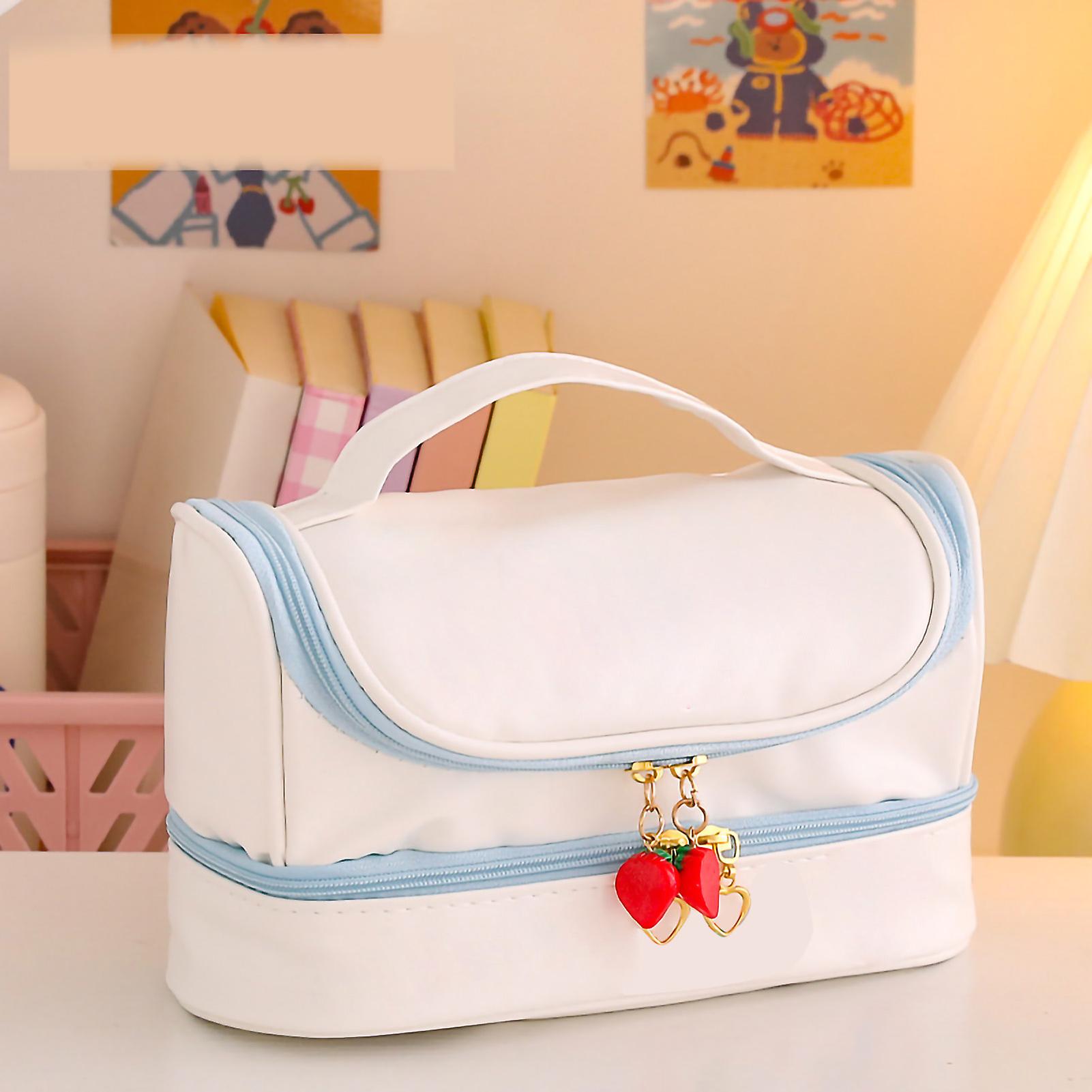 Pencil Bag Cute Cartoon PU Waterproof 2 Layer Portable Pen Storage Case with Strawberry Shaped Double Zipper Blue
