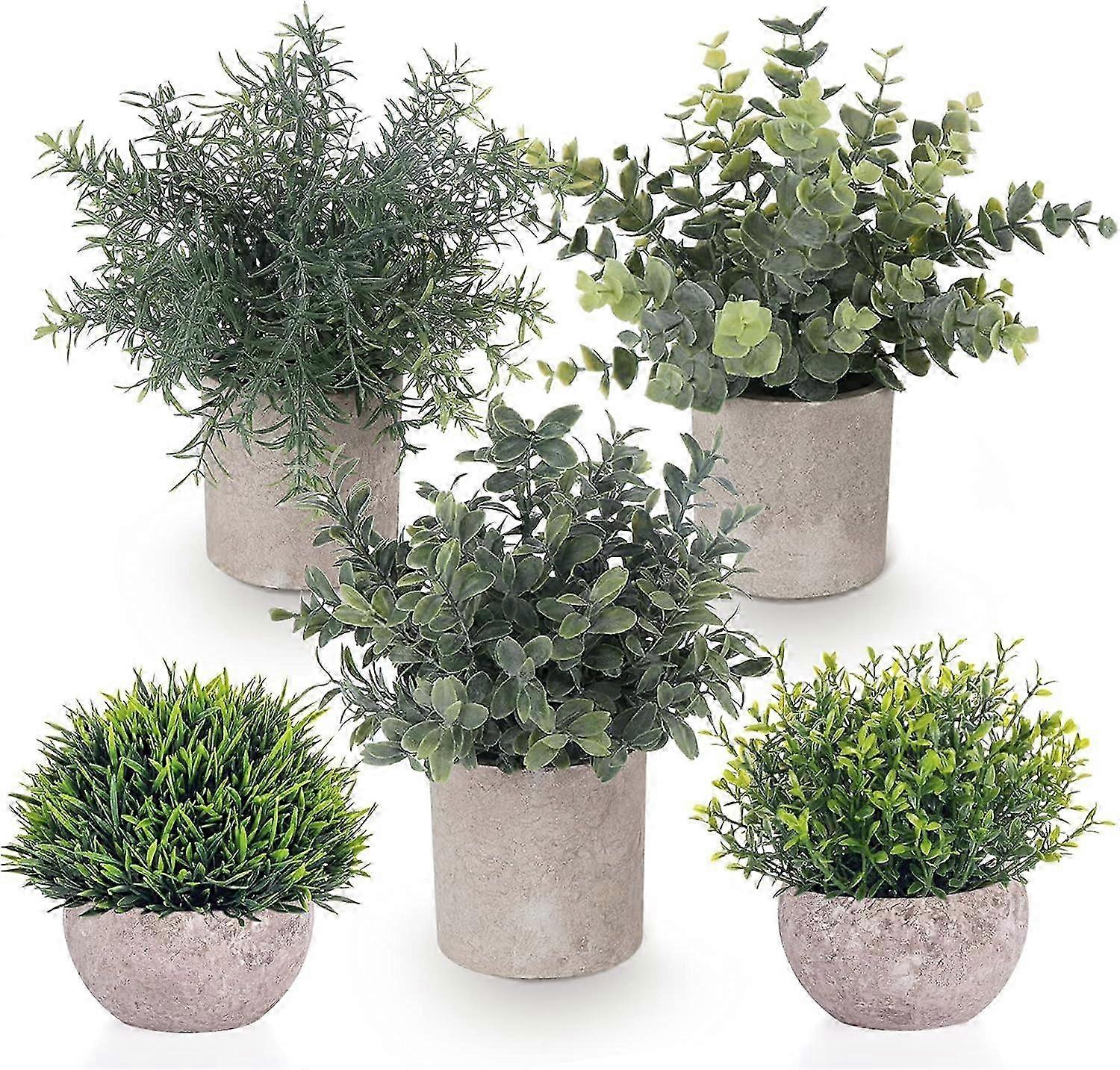 Set of 5 Mini Potted Artificial Plants including Small Eucalyptus and Rosemary Greenery in Plastic Faux Greenery Assorted