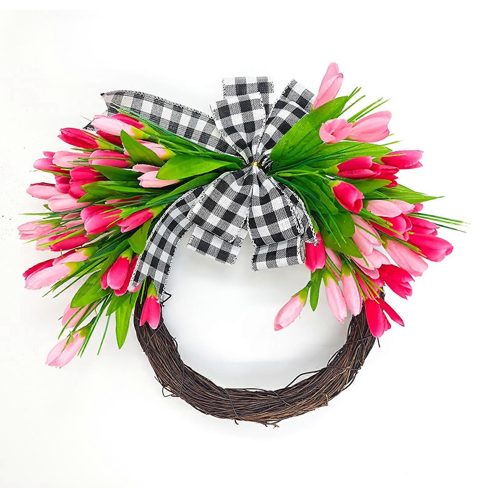 Spring Welcome Sign Artificial Tulips Wreath Festival Front Door Accent Realistic and Charm Spring Wreath 40cm Diameter