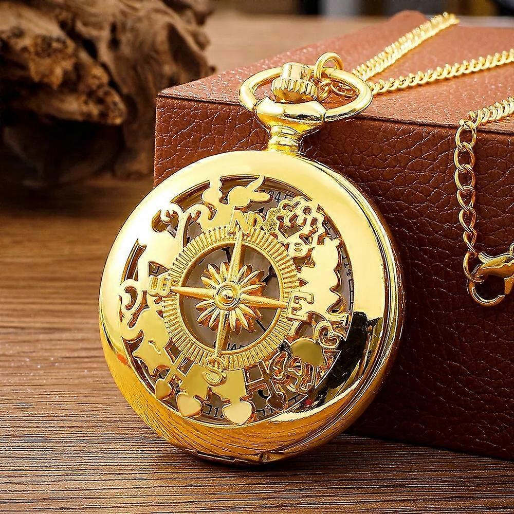 Antique Steampunk Vintage Arabic Numerals Quartz Pocket Watch Gold Case Necklace Pendant Clock Chain Mens Women