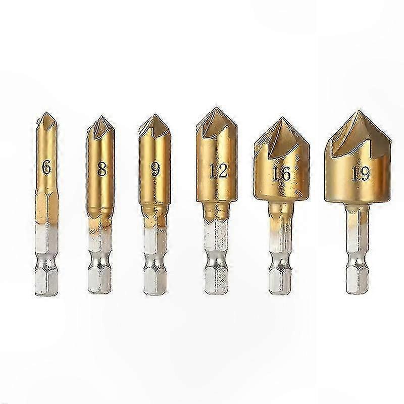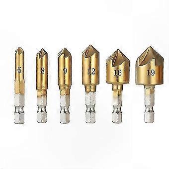 Titanium-Coated Hex Shank Drill Bits Set - 6-19mm Five-Blade Woodworking Chamfer Tool with 90 Degree Ring Edge Reamer