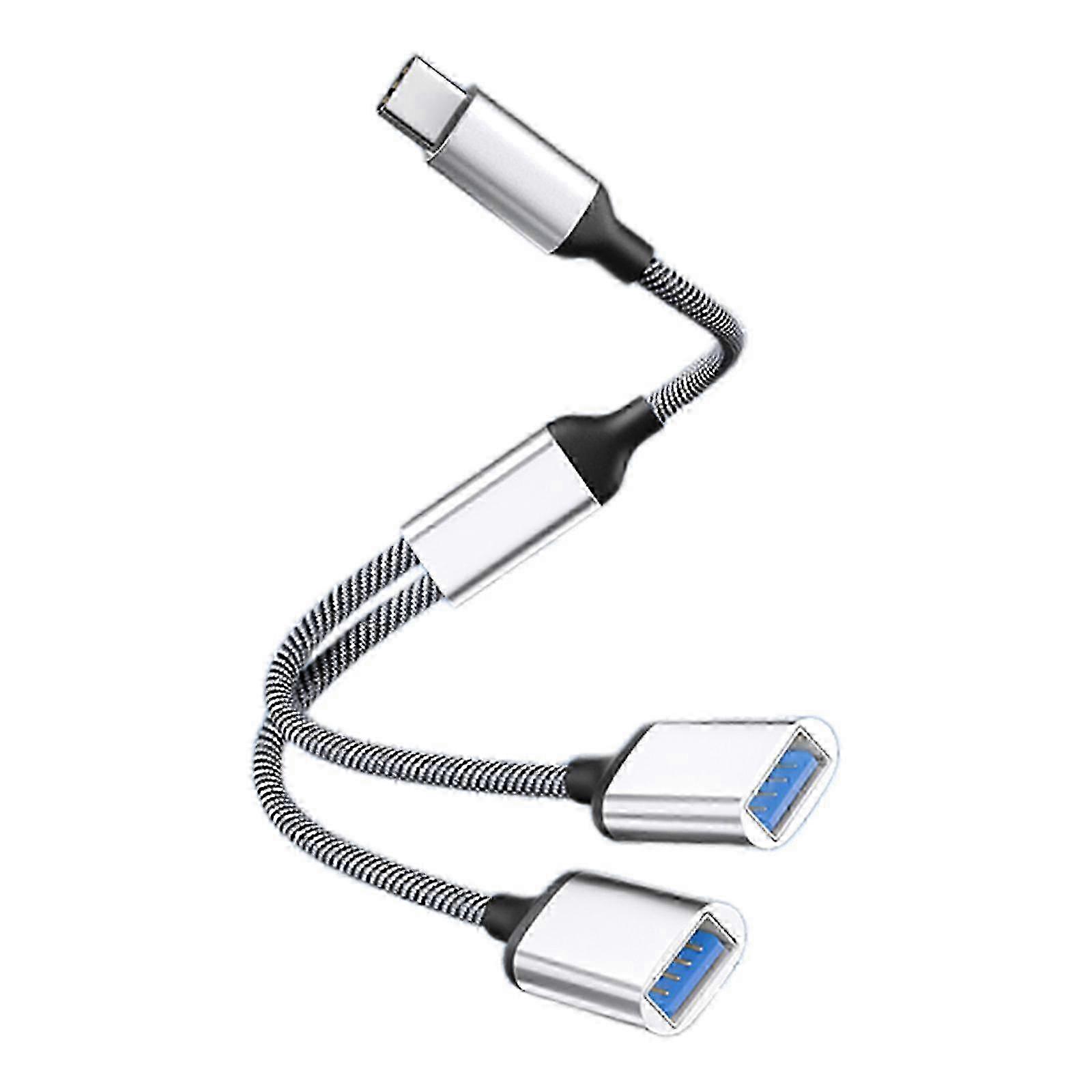 Type C to 2 USB OTG Adapter Y Splitter Cable USB 2.0 Type C Expansion HUB Data Charging Braid Cable Silver w