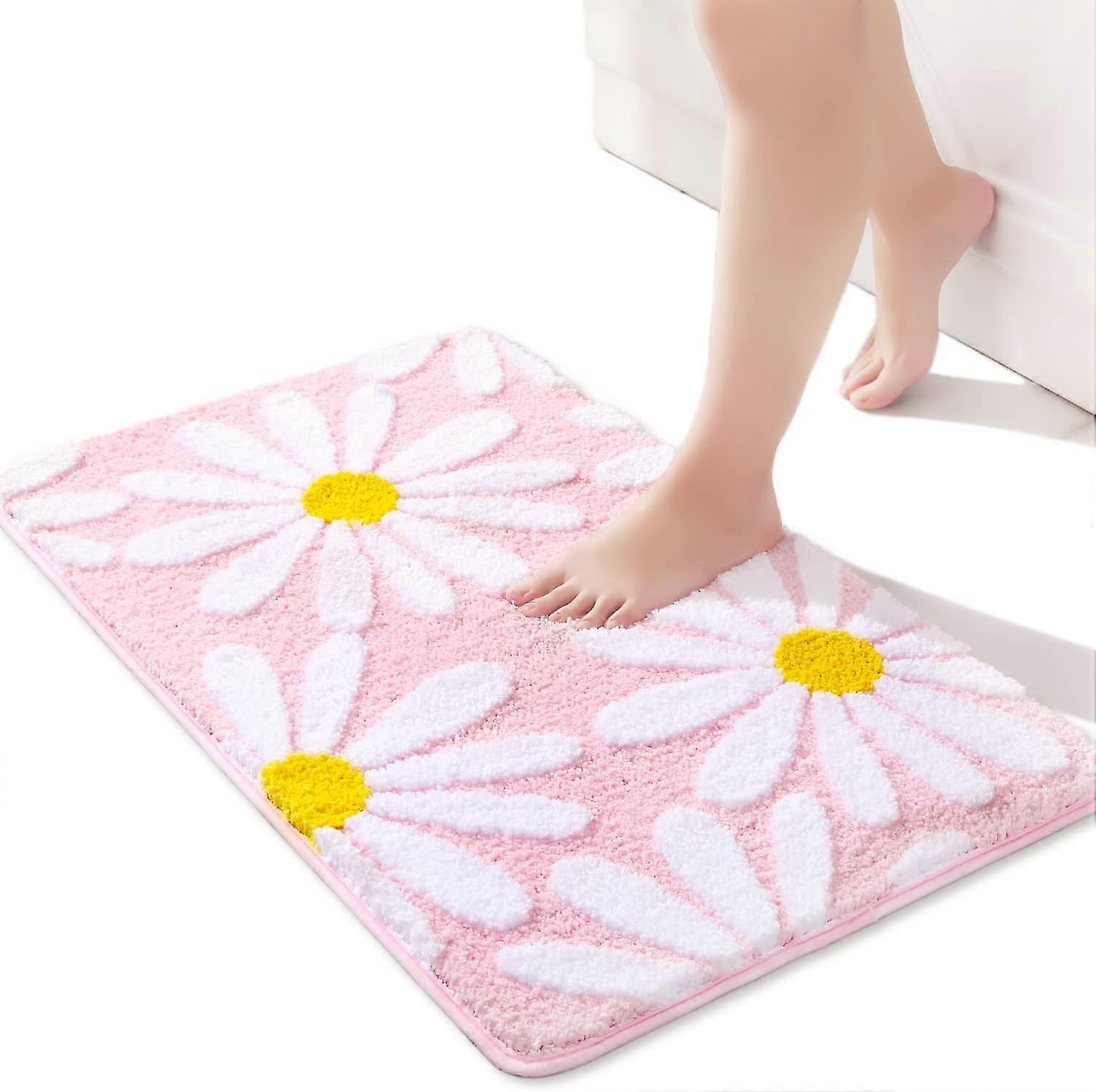 Wabjtam Pink Bathroom Rugs Cute Daisy Bath Mat White And Yellow Flower Decor Rug Non Slip Floor Carpet Microfiber Bathmat 16"x 24"