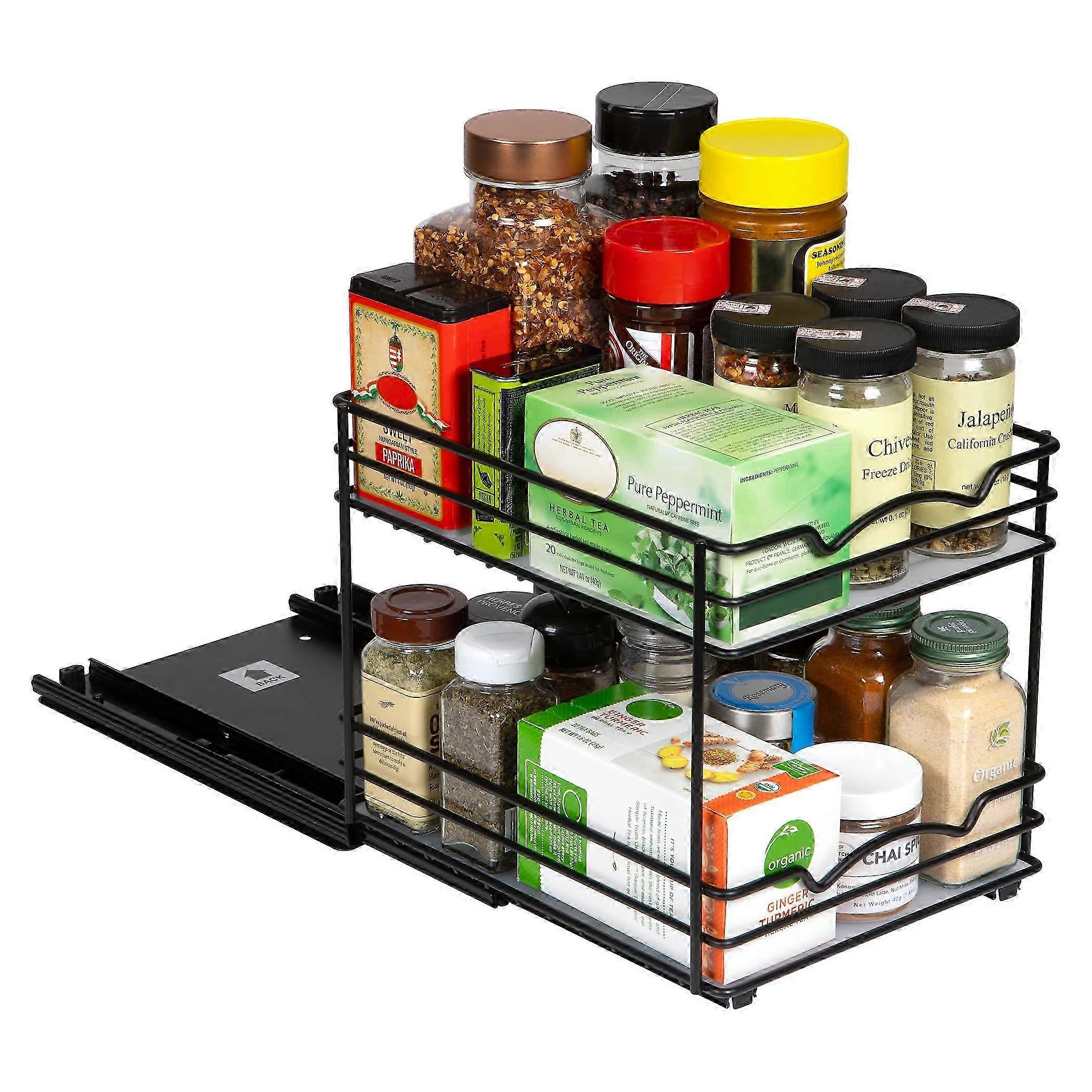 SPICE CABINET ORGANIZER: Having limited space in your kitchen cabinet ? Then our slide out spice rack is the perfect solution to keep your spices tidy and within reach..PERFECT FOR NARROW CABINETS: Measuring 8-3/8" this narrow spice rack is great for utilizing tight spaces in narrow cabinets. Easily find all your spices in your cabinet..MULTI-PURPOSE KITCHEN SPICE ORGANIZER: You can organize everything in your cabinets with the shelve! Spices, craft supplies, and other items..MADE TO LAST. DURABLE & STUDY QUALITY: Steel with Black Finish. Our sliding spice rack roll out shelves is manufactured with a pull out system that slide out very smooth..SIMPLE! EASY TO INSTALL. HARDWARE INCLUDED: Our Slide out pantry spice organizer dimension measure 8-3/8" Wide x 10 -3/8" Depth x 8 -7/8" Height and you can easily install it with no experience .