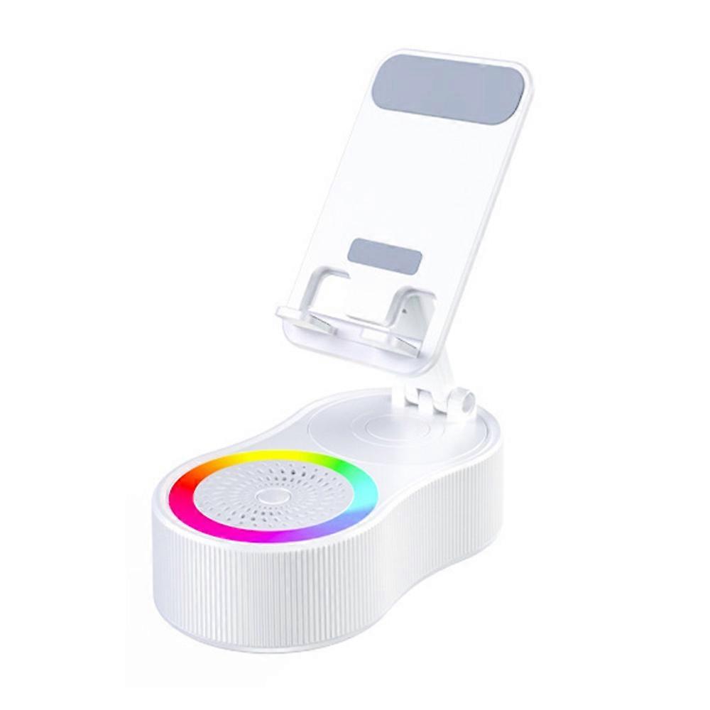 ・【Versatile 3-in-1 Design】Combines a phone stand,power bank,and Bluetooth-compatible speaker in one compact device for ultimate convenience. ・【360° Rotation & Adjustable Height Phone Holder】The phone holder part features a 360-degree rotating base and height adjustment for optimal viewing angles and ergonomic use. ・【Ambient Lighting】Integrated atmospheric lighting adds a touch of ambiance to any space. ・【Portable Power Bank】Built-in 2000mAh battery serves as a power bank to charge your devices on the go. ・【High-Quality Audio】Delivers clear sound with a frequency response range of 100Hz-20KHz and a signal-to-noise ratio ≥85dB. ・【Bluetooth-compatible 5.3 Connectivity】Latest Bluetooth-compatible technology ensures stable and efficient wireless connection up to 10 meters. Specifications: ・Model: WYS-2303BT ・Connectivity: Bluetooth-Compatible ・Bluetooth-Compatible Version: 5.3 ・Frequency Response: 100Hz-20KHz ・Signal-to-Noise Ratio: ≥85dB ・Number of Speakers: 1 ・Effective Range: 10 meters ・Material: Plastic ・Water Resistance: Not waterproof ・Battery Capacity: 2000mAh Package included: ・1 x Phone Holder Bluetooth-Compatible Speaker ・1 x Data Cable ・1 x English and Chinese Manual